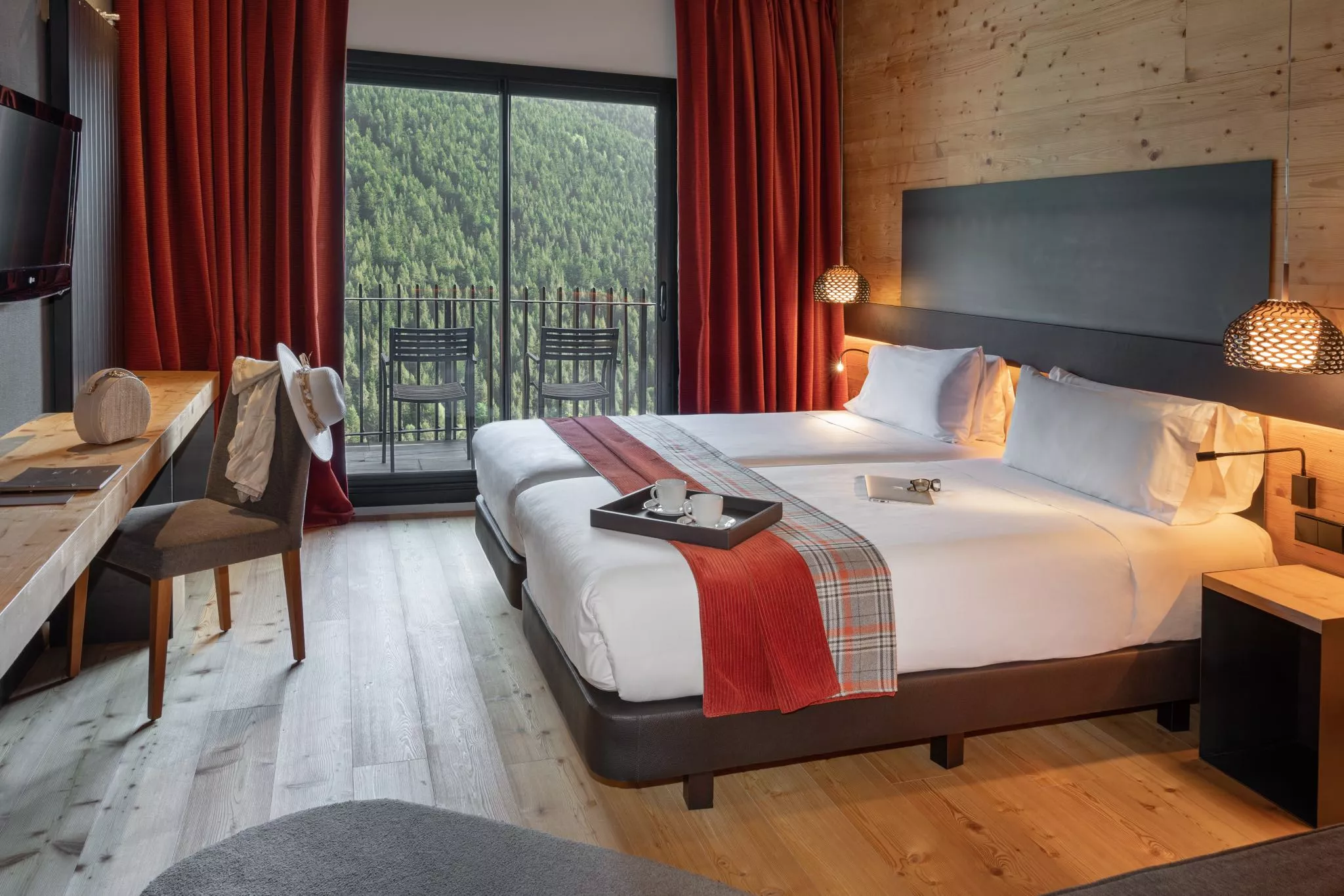 Habitación espaciosa, muy confortable y decorada de forma exquisita combinando elegantemente materiales nobles y naturales como la madera de arce, la piel y los tejidos que proporcionan calidad y confort. Todas las habitaciones Deluxe disponen de una terraza equipada con un elegante mobiliario para disfrutar de las espectaculares vistas a las pistas de Grandvalira y a las montañas de Soldeu. El baño es completo con WC independiente, y bañera o ducha.
