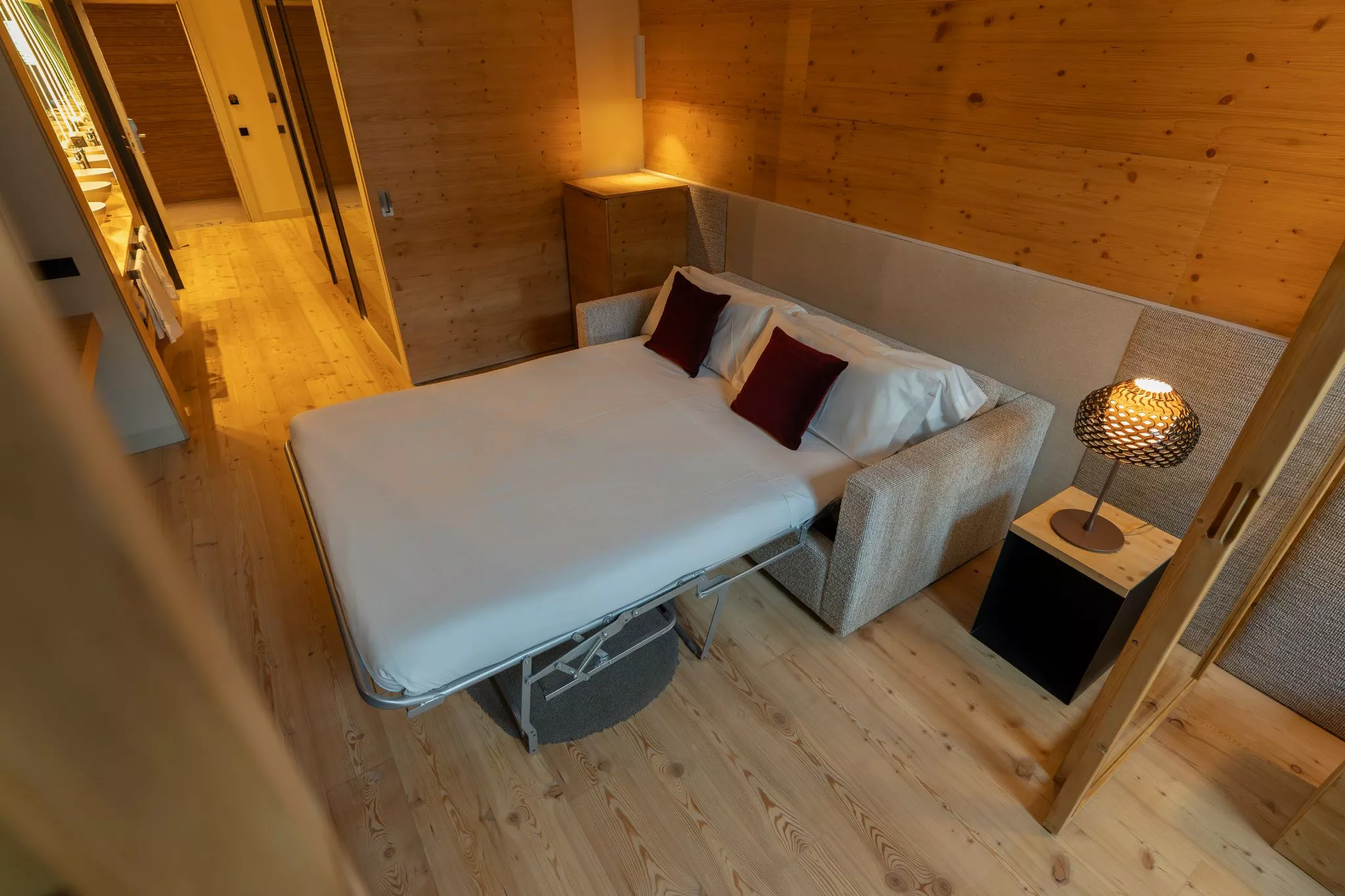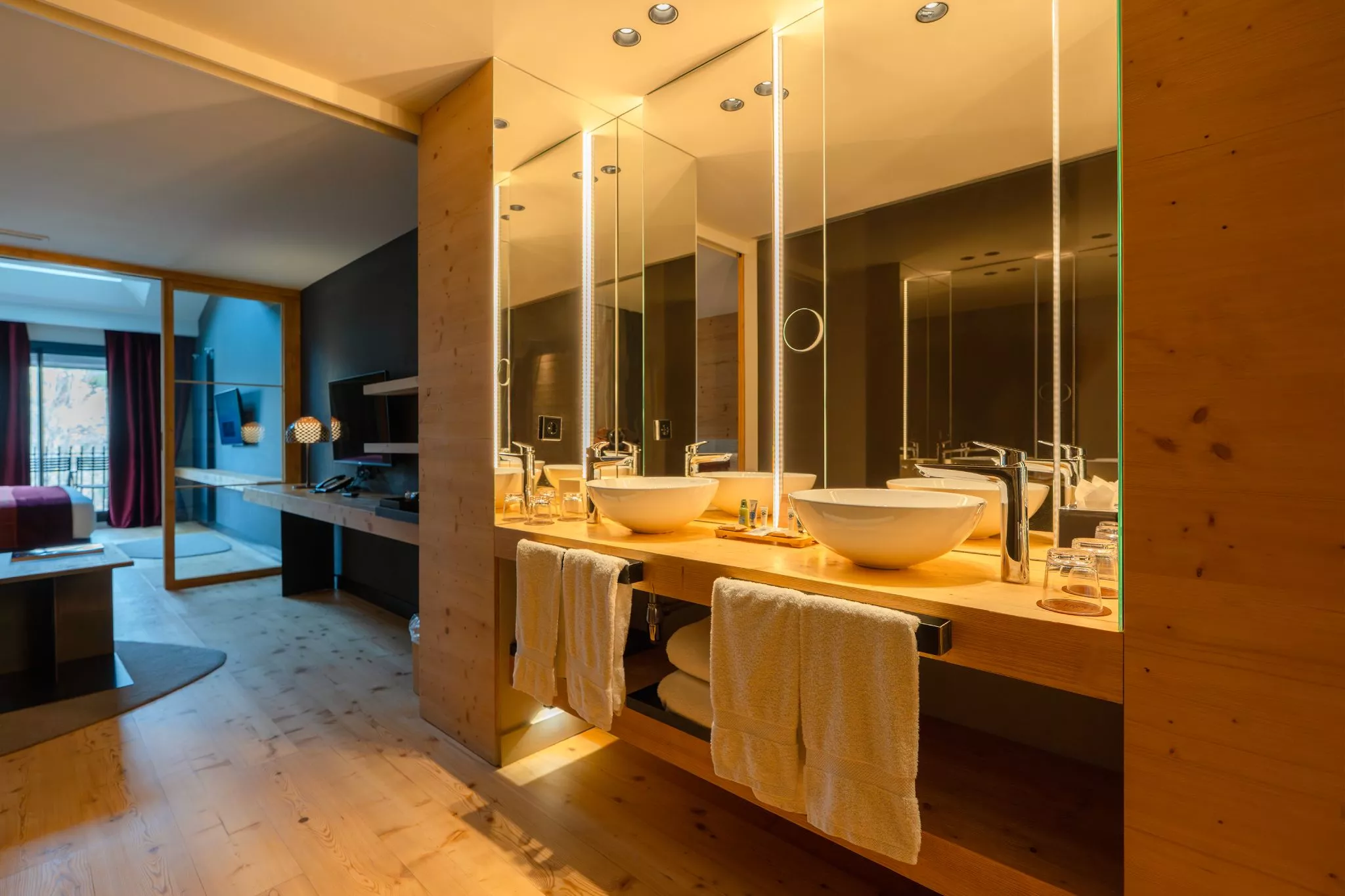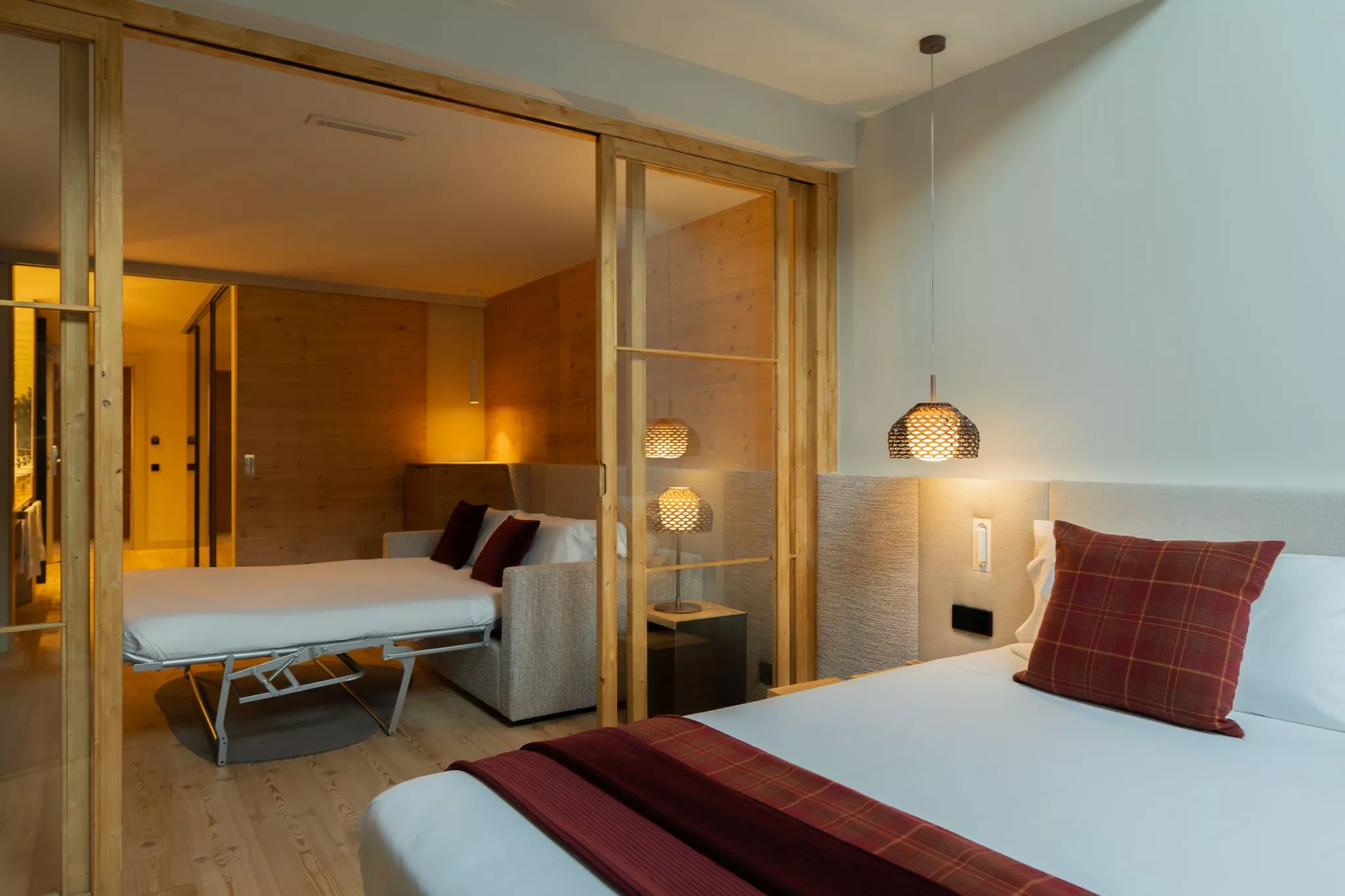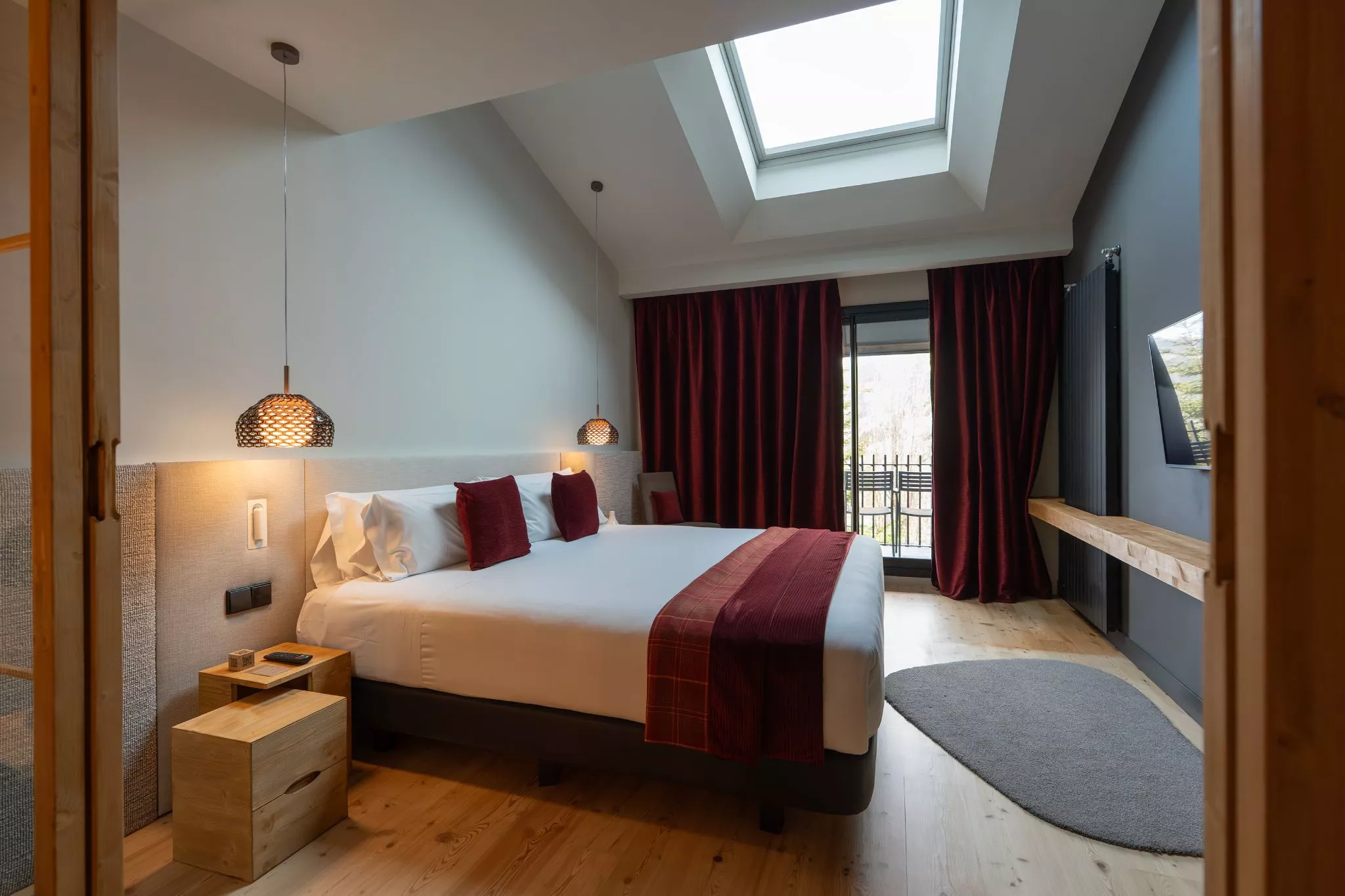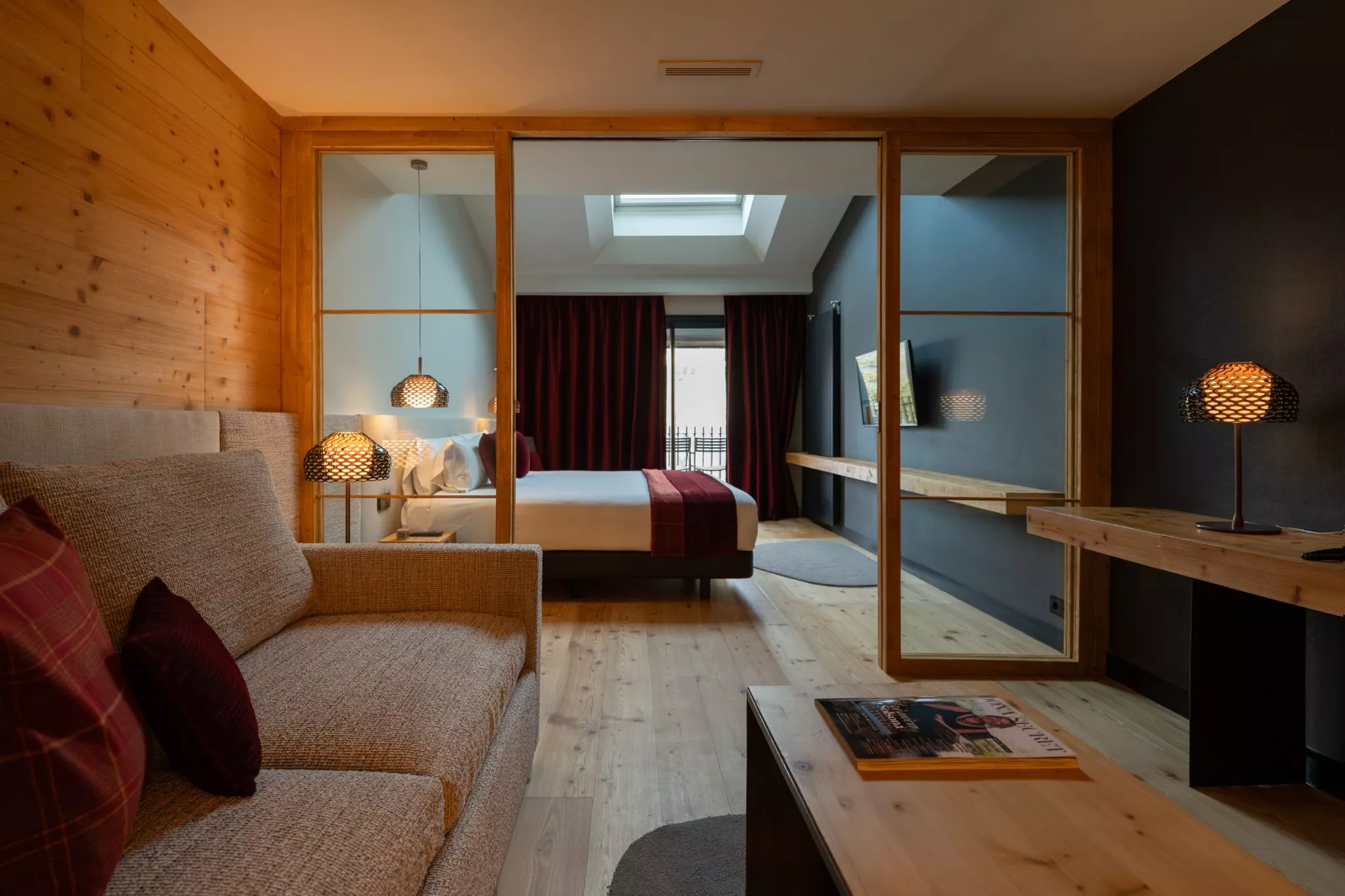Excepcional, amplia y confortable habitación con servicios y atenciones especiales, para una estancia inolvidable en Andorra. Con 46m2, exquisitamente decorados combinando materiales nobles y naturales, te sentirás como en casa. Nuestras suites cuentan con dos espacios independientes, separados por una puerta corredora que crea dos ambientes: uno en el que encontramos la cama King size y otro con un cómodo sofá cama. El cuarto de baño es completo, con WC independiente. Todas las habitaciones suites del hotel disponen de una terraza, equipada con un elegante mobiliario para disfrutar, al despertar, de las mejores vistas a las montañas y pistas de esquí.